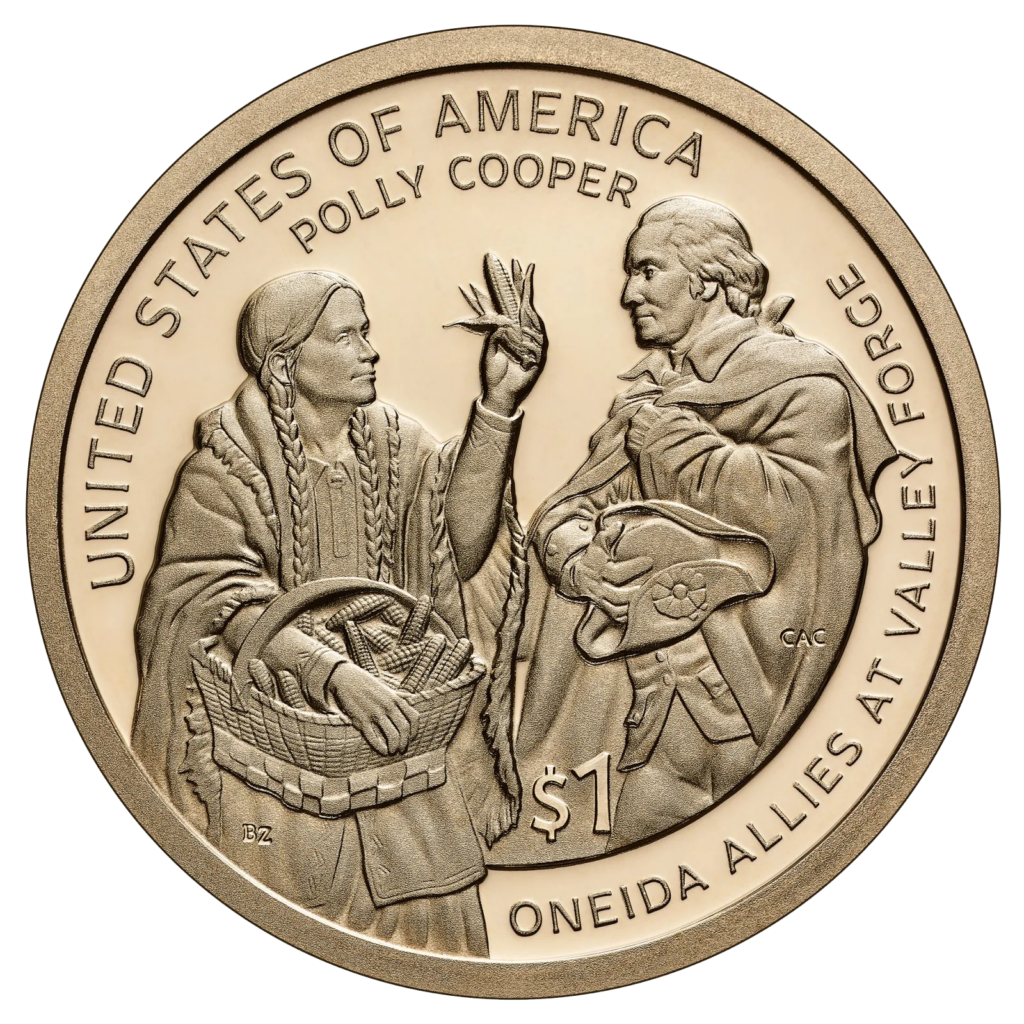 “During a harsh winter, Polly Cooper led Oneida warriors from Central New York to Valley Forge to provide food and relief to George Washington’s army, ensuring their survival. This new coin will ensure the story of Polly Cooper’s courageous role in the American Revolution lives on for generations to come,” said Chuck Schumer, U.S. Senator (NY) and Senate Minority Leader. “With America’s 250th birthday here, it is fitting to honor her legacy with the release of this new coin. I am proud to have fought to establish the Native American $1 Coin to honor heroes like Polly Cooper.”