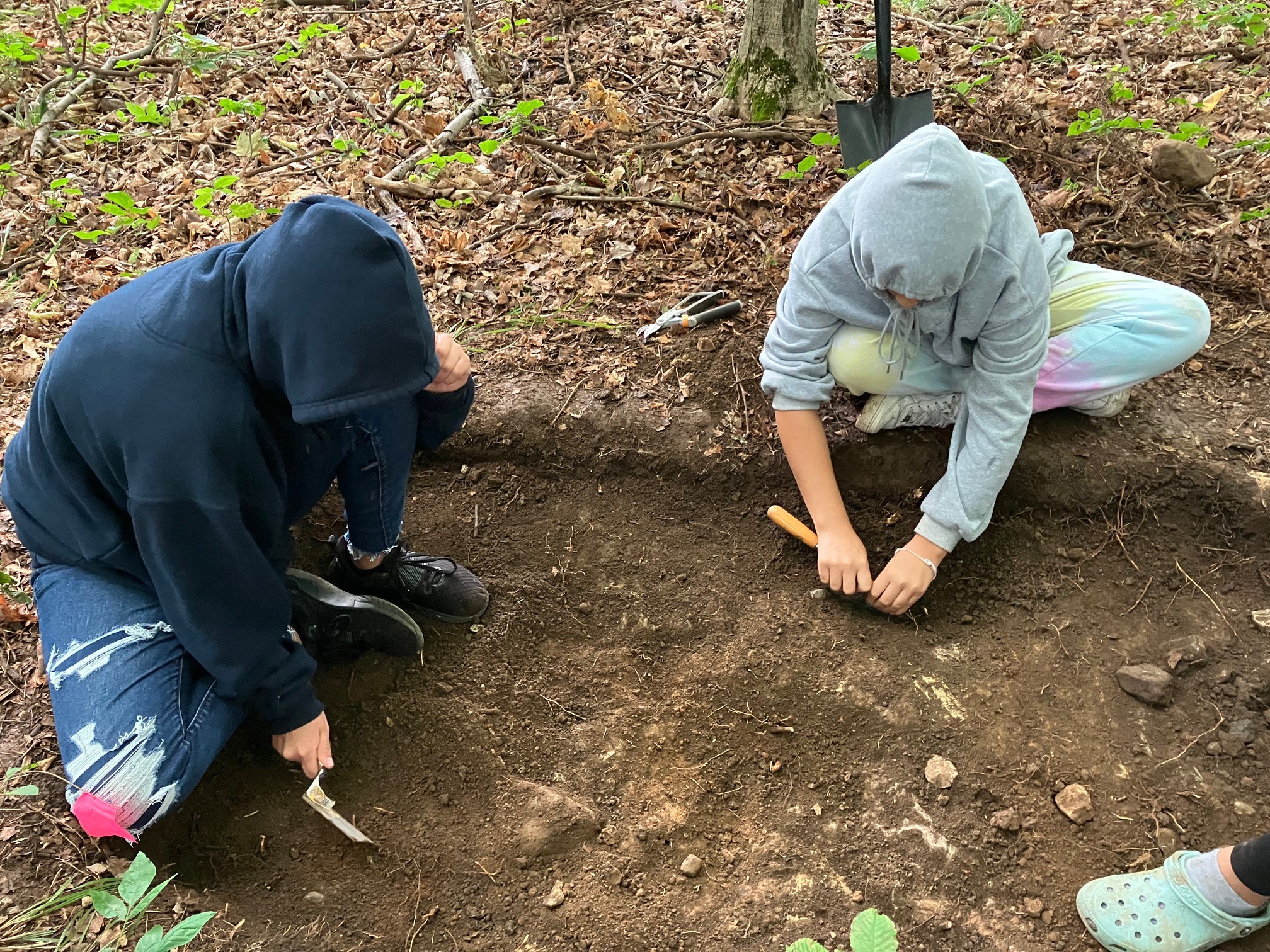 The Crew also was able to visit the Simpson archeological dig site – a contemporary to Nichols Pond – to search for indications of Oneida occupation of the site generations ago. The group used shovels to clear the topsoil and screens to sift and look for artifacts. They used trowels to clear off the bottom of the test unit to look for items as well. They found rocks that had been used around hearths, ceramic sherds and tools made from chert – a small rock resembling flint.